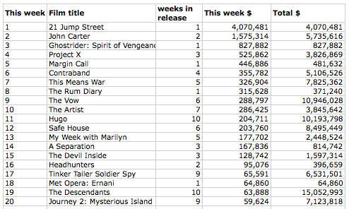 Also opening over the weekend was the second Ghostrider film, Ghostrider: Spirit of Vengeance. Starring Nicholas Cage, the film took $828,000 across 239 screens for an average of $3,464 per screen.