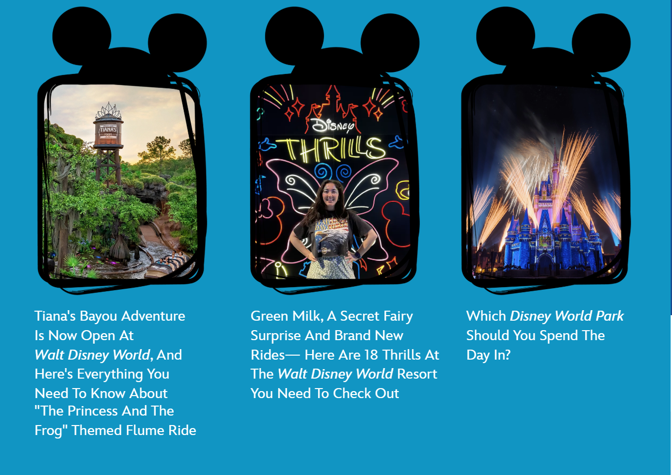 The canny-eyed reader will have noted a commercial lean to that last tab, which clicks through to a dedicated advertising page for the theme park, with subtle integrated articles sporting titles such as: ‘Tiana’s Bayou Adventure Is Now Open At Walt Disney World, And Here’s Everything You Need To Know About “The Frog And The Princess” Themed Flume Ride’.