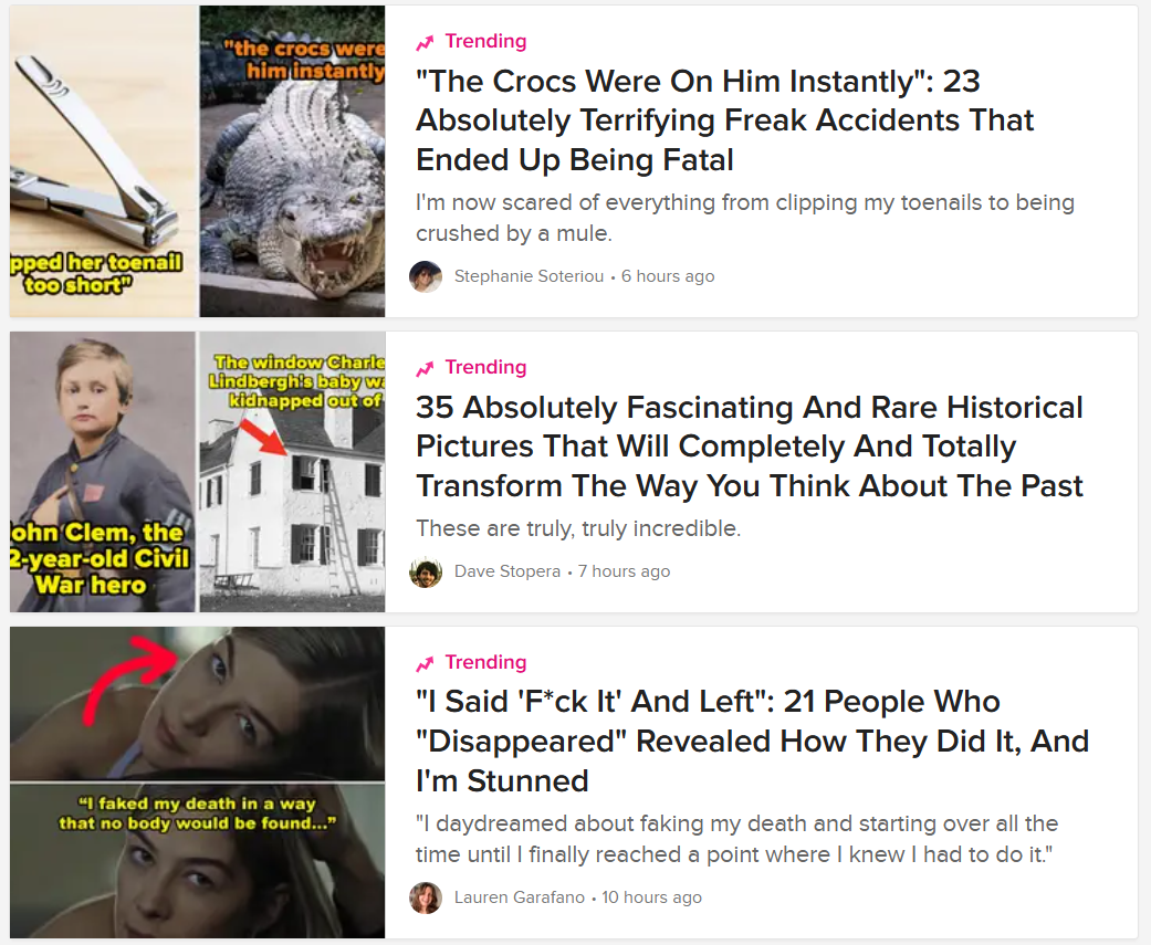 They are trying, though. Currently, the front page of Buzzfeed include tabs for ‘Quizzes’, ‘TV & Movies’, ‘Videos’, ‘Tasty’ (a food vertical), ‘Shopping’, and ‘Walt Disney World Resort’.