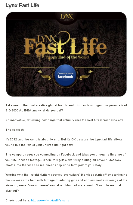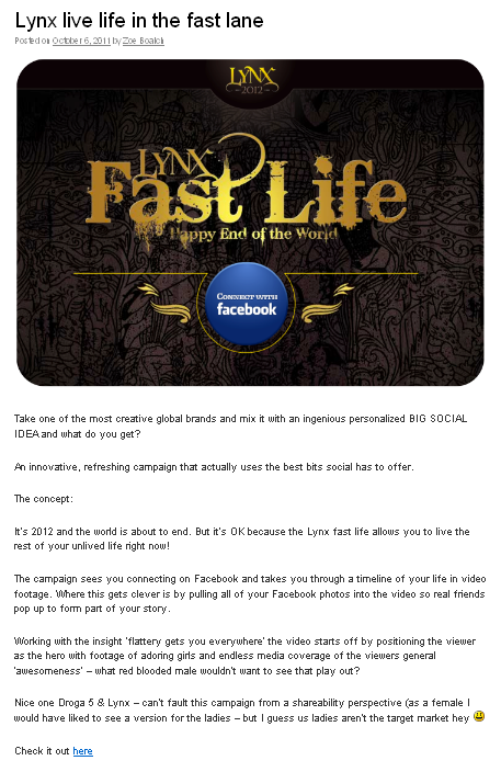 The Contagious blog entry on Lynx by Zoe Boalch:And here’s a rather similar entry on Zenith Optimedia’s blog, posted the very next day: