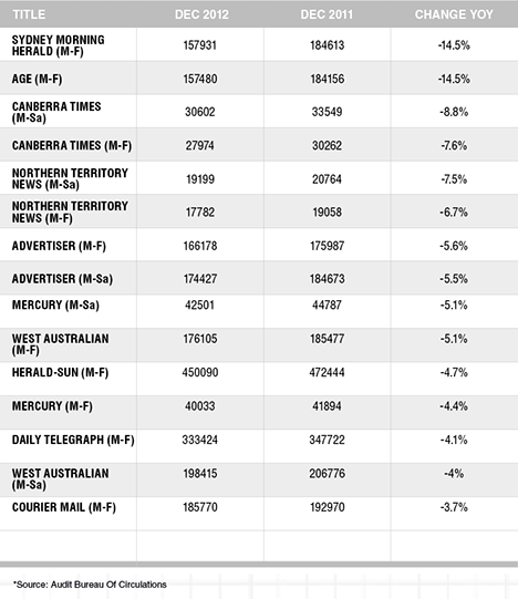 News Limited titles such as Sydney’s Daily Telegraph fell a comparatively small 4.1 per cent to 333,424, Melbourne’s Herald Sun was down 4.7 per cent to a still healthy 472,444 copies, Sydney’s Sunday Telegraph was down 3.2 per cent and the Melbourne’s Sunday Herald Sun dropped 5.7 per cent to 514,671.
