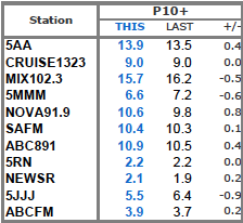 At the ABC, 891AM jumped from 10.5% to 10.9% while Triple J dropped from 6.4% to 5.5% and ABC FM increased from 3.7% to 3.9%.