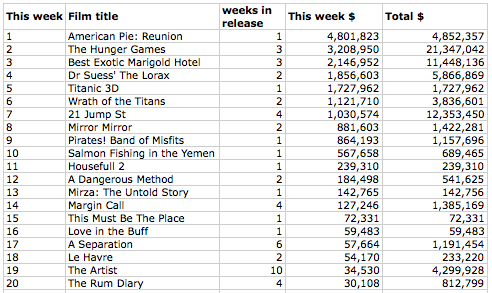 The return of Stifler, Jim, Finch and Oz in American Pie: Reunion was enough to bump The Hunger Games off top spot in the Easter Weekend’s box office.