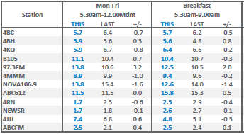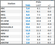 Similarly Nova won in drive time, where Meshel, Tim & Marty from 4-6pm and the Fitzy & Wippa 6-7pm hour had a share of 16.8%, a slight drop from 16.9%.