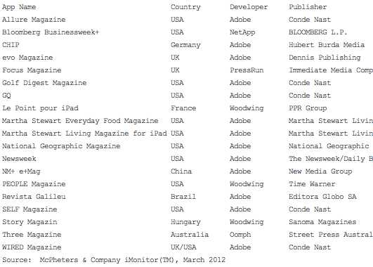 The iMonitor list of Best Magazine Apps for iPad is published by US-based research group McPheters & Company and gauges app quality on design, functionality and use of rich media content.