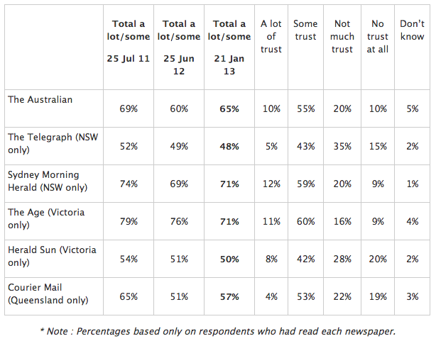Among the broadsheet newspapers 10% of Australians said they had “no trust at all” in The Australian, compared with 65 per cent who said they had some or a lot of trust in the newspaper.