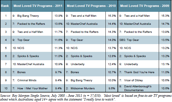 George Pesutto, industry director – media, Roy Morgan Research, said: “In the latest 2011 data we’re seeing a number of programs with declining “really love to watch” numbers, particularly compared to the last couple of years.”