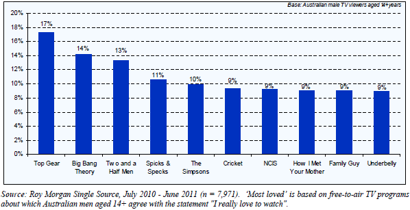 Among Aussie men, Top Gear is the most loved show, followed by Big Bang Theory and Two and a Half Men.