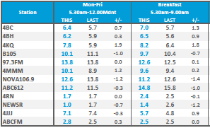 Southern Cross Austereo’s B105 – part of the Today Network – dropped from 11 percent to 9.8 percent, while 4MMM lifted from 8.6 percent to 9.7 percent in the overall Monday to Sunday share.