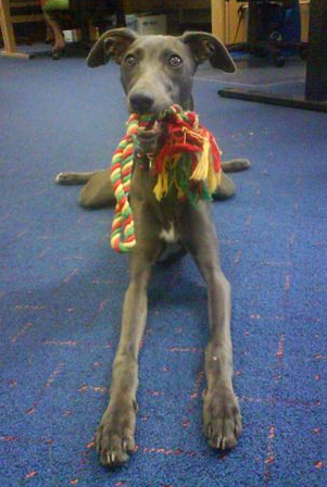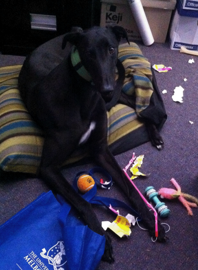 Harry, a rescued Greyhound, at the offices of the Australian Academy of Cinema and Television Arts.