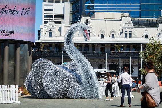 A swan made from 10,000 plastic bottles launches Containers for Change in WA
