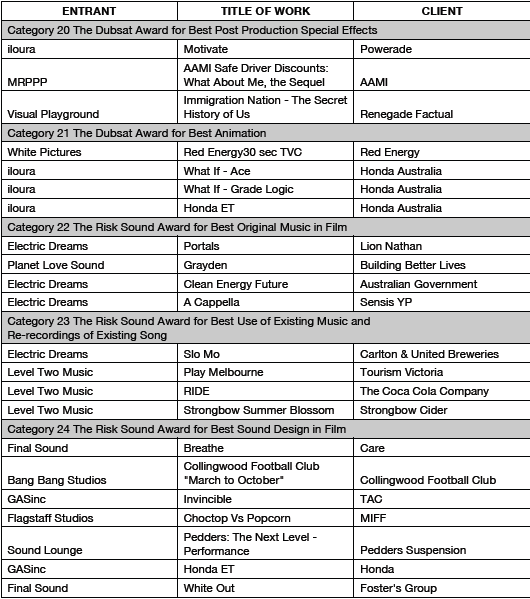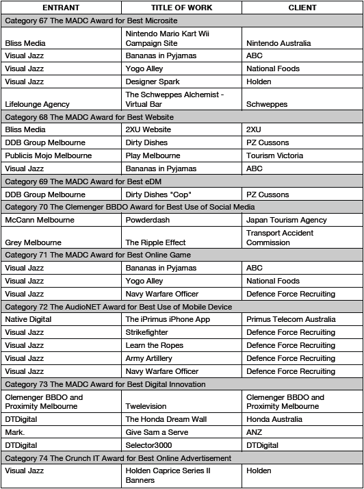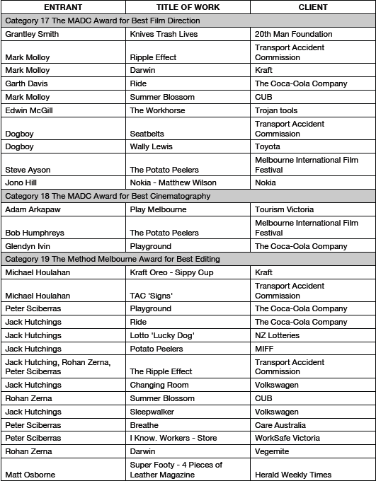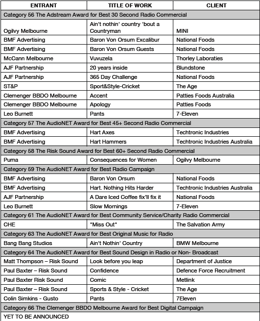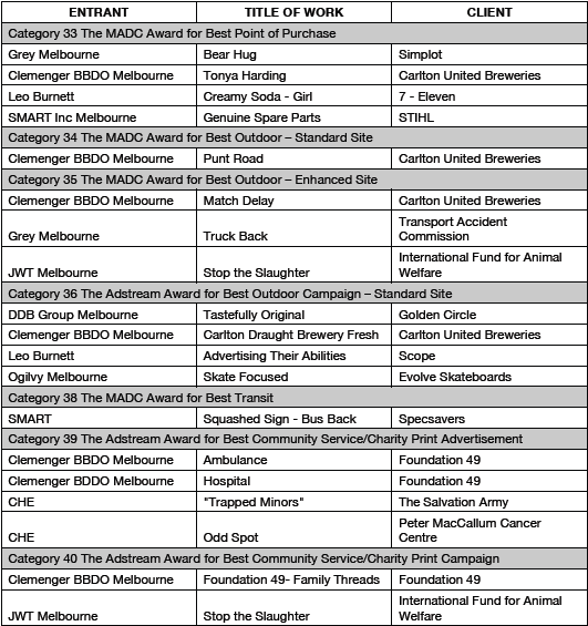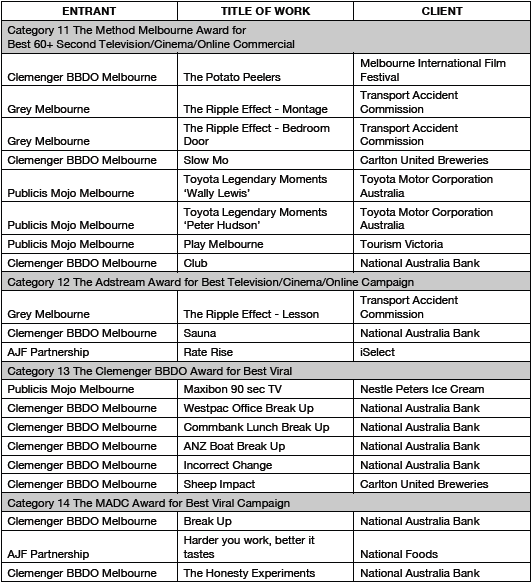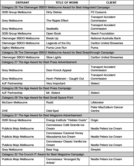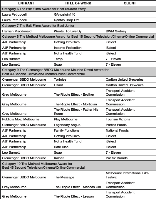 However, Clems’ dominance is no match from that showed by GPY&R Melbourne last year, which had 38 finalists compared with Clems’ 17. But the Patts did not enter this year claiming it did not have the budget.