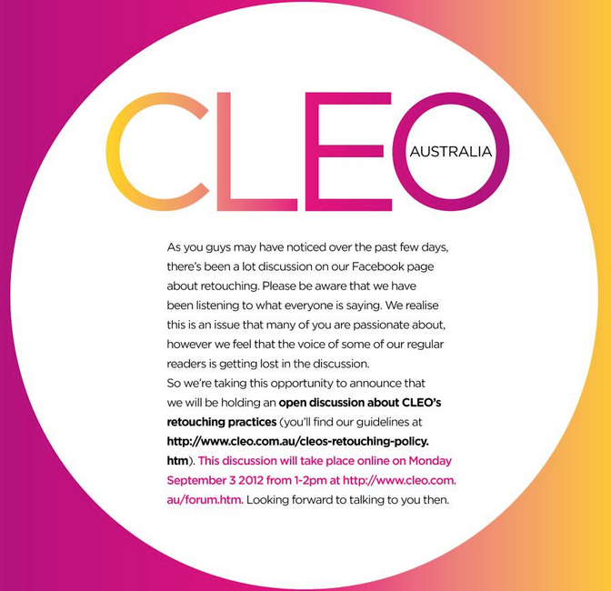 As you guys may have noticed over the past few days, there’s been a lot of discussion on our Facebook page about retouching. Please be aware that we have been listening to what everyone is saying. We realise this is an issue that many of you are passionate about, however we feel that the voice of some of our regular readers is getting lost in the discussion. So we’re taking this opportunity to announce that we will be holding an open discussion about CLEO’s retouching practices. This discussion will take place online on Monday September 3 2010 from 1-2pm at http://cleo.com.au/forum.htm. Look forward to talking to you then.