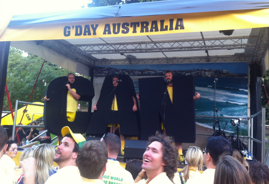 On South London’s Clapham Common, 935 Australians gathered to form the word G’Day while wearing Australia’s gold colours to welcome the Olympic team to the British capital.