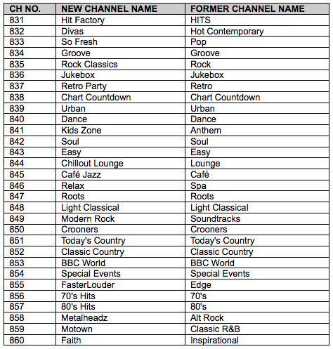 The three refreshed music channels include ROCK CLASSICS (Channel 835), MODERN ROCK (Channel 849) and METALHEADZ (Channel 858):