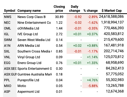 Nine lost 1.6%, falling to a market cap of just over $1.9bn. Southern Cross Austereo lost 1.2%.