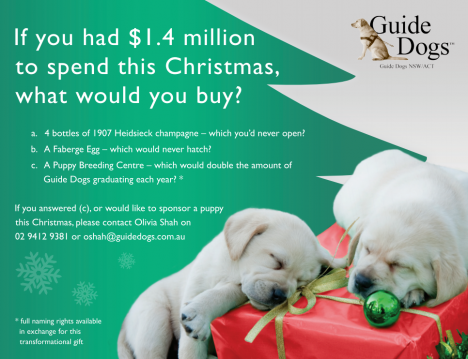 Guide Dogs NSW/ACT has launched a press ad in the Australian Financial Review that asks readers how they would spend $1.4m – the amount needed to build a guide dog puppy breeding centre.
