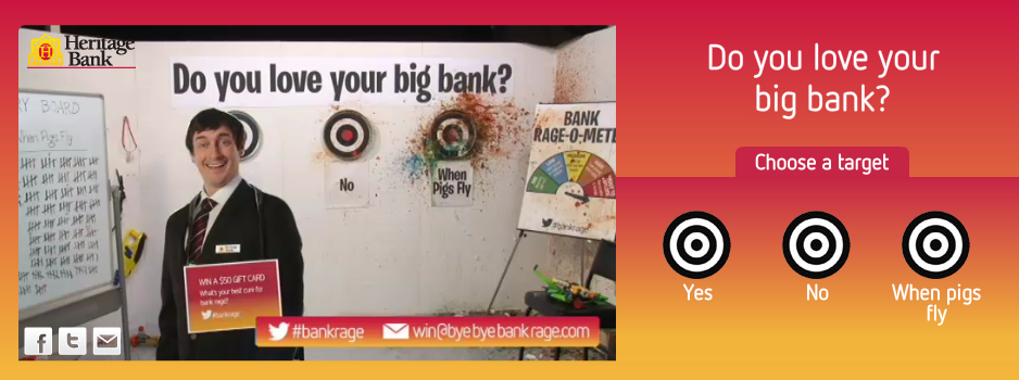 Heritage Bank is running hourly competitions using the #bankrage hashtag, and asking people to nominate what can be thrown at targets within the ad at byebyebankrage.com.