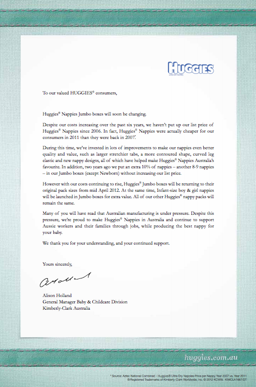 Joanna McCarthy, corporate communications manager for Kimberly-Clark Australia, told Mumbrella: “We wanted to be upfront with mums. We didn’t want to pull the wool over their eyes. We haven’t put up the prices of Huggies for six years, but we just couldn’t continue to absorb the pressures of a tough manufacturing environment.”