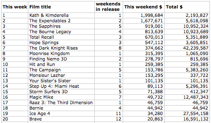 The only other major release this weekend was Hit and Run, from distributor Pinnacle Films which took $259.000 across 108 screens for an average of $2,402.
