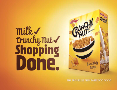 I heard the Crunchy Nut ad on radio as I was driving out of Sydney. It resembled a radio quiz where the prize was a box of Crunchy Nut. Even though three “callers” gave the right answer the host said they were all wrong because he wanted the box of Crunchy Nut himself.