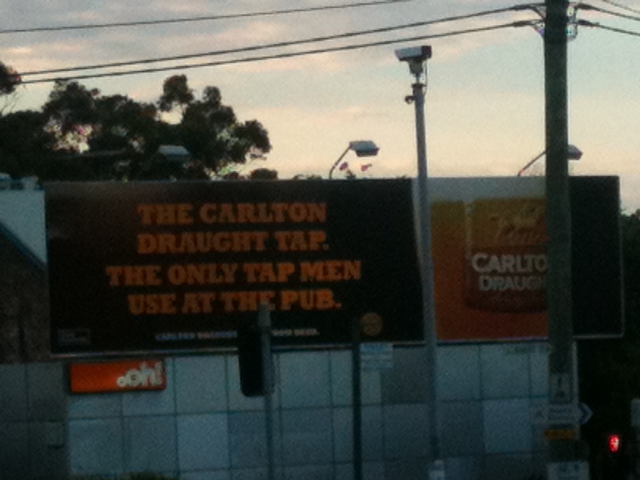 The billboard, located at the corner of Victoria Road and Robert Street in Rozelle, Sydney, reads ‘The Carlton Draught Tap. The only tap men use at the pub’.