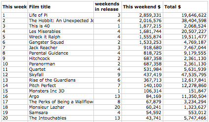 The Ang Lee-directed Life of Pi made $2.859m at the box office over the weekend across 552 screens for a $5,180 average. The film is in its third week in release for Fox.