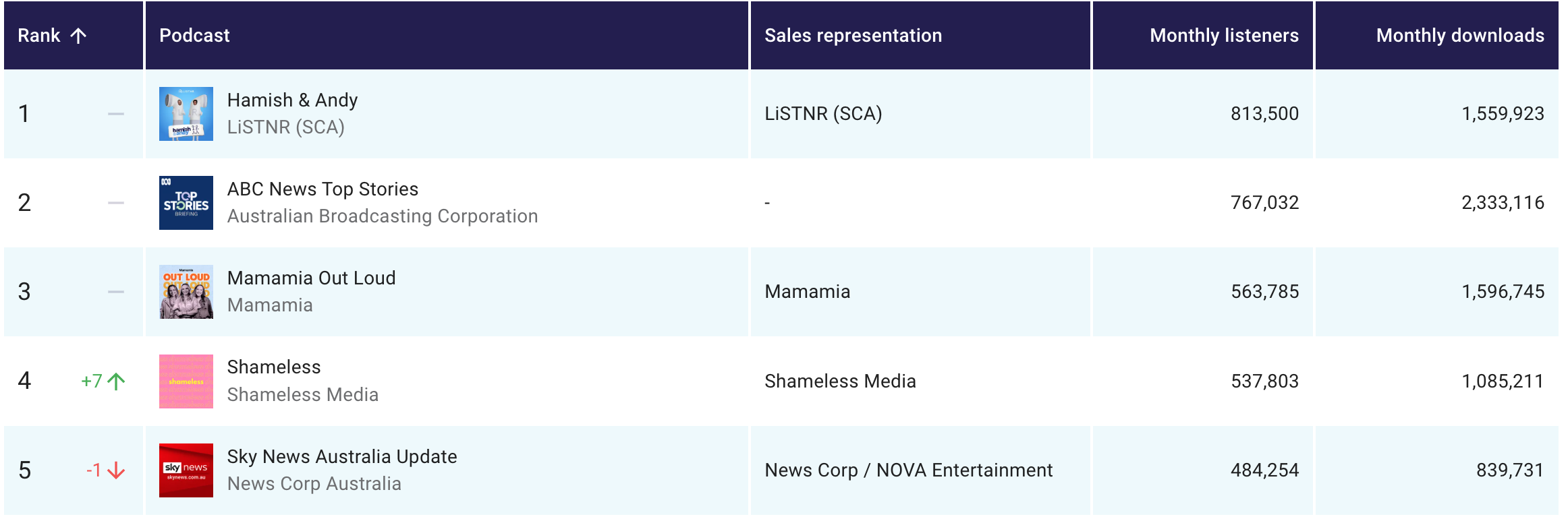Rounding out the top five were Mamamia Out Loud in third with 563,785 listeners and 1,596,745 downloads; Shameless with 537,803 listeners and 1,085,211 downloads; and Sky News Australia Update with 484,254 listeners and 839,731 downloads.