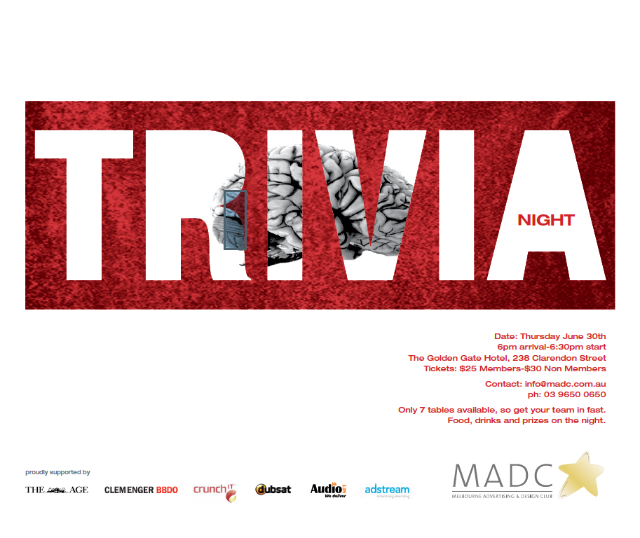 The Melbourne Advertising & Design Club is reviving its advertising trivia night, with the first round to be held at the Golden Gate Hotel in South Melbourne on 30 June.