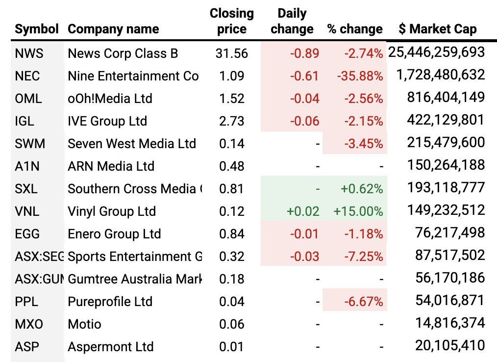Seven West Media lost 3.5%, Ooh Media lost 2.6% and Ive group lost 2.2%.