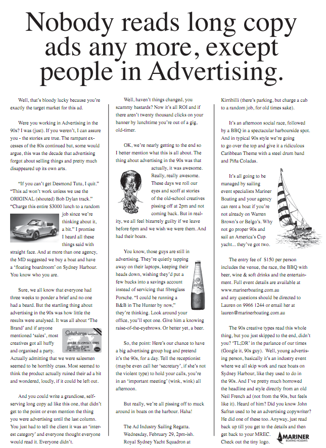 The promotion, for Mariner Boating Holidays’ Ad Industry Sailing Regatta, is not revealed until the 11th paragraph.