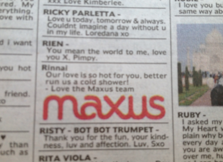 Just two and a half columns of Valentines Day classifieds in the Daily Telegraph this year. A far cry from 1983 when there were so many Valentine greetings the paper published a 32 page liftout in the middle of the paper.