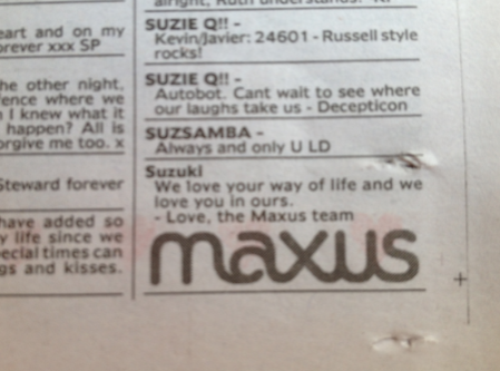 The media agency has peppered the classifieds section with loving tributes to clients, which in Melbourne include Susuki, Domino’s Pizza, Jeep, Hungry Jack’s, Melbourne Airport and Monash University.