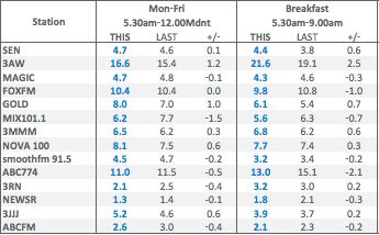 The ratings come the week after Melbourne’s radio market suffered the biggest revenue fall of any of Australia’s metro markets, down 7% to $17.07m, according to Commercial Radio Australia.