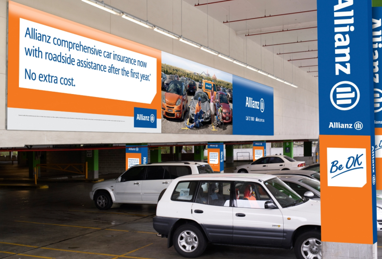Messaging to promote Allianz’s car insurance will run on parking tickets, boom gates on entry, parking bays, floor decals, pillar wraps, eyelites and wall ‘artworks’ up to 21 metres in size at sites such as Westfield Castle Towers, Parramatta, Doncaster and the Glen.