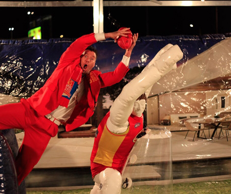 The Metricon Marks campaign encourages footy fans to have their photos taken while catching a footy ball next to the inflatable figures.