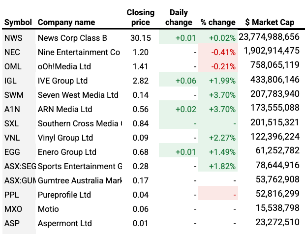 The biggest two locally listed media and marketing stocks fell today, while the rest of the market nudged into positive territory.