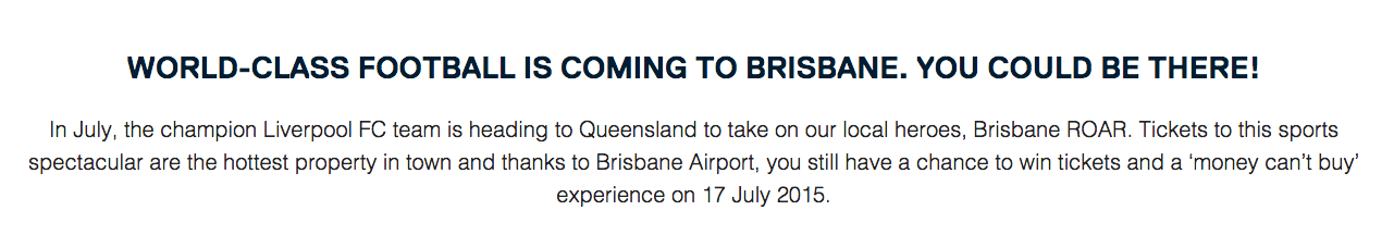 Unfortunately no-one pointed this out to Brisbane Airport, which is offering “money can’t buy” football experience to plug its sponsorship of Liverpool FC v A-League side Brisbane Roar in July.