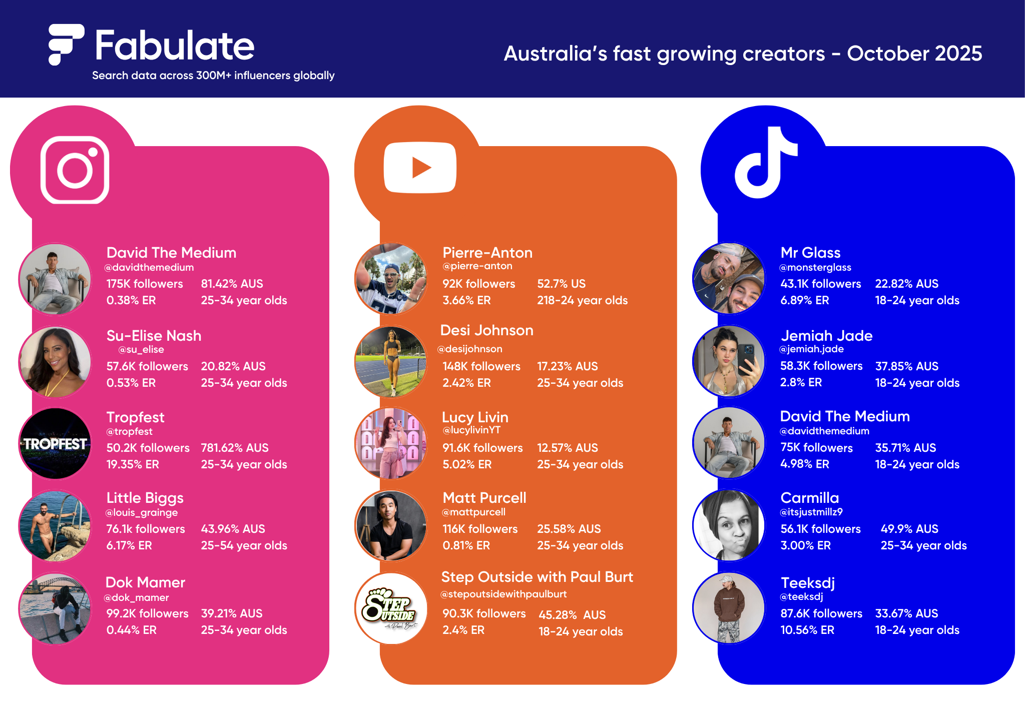 Other creators to see significant lifts in their online followings include David The Medium who, according to Fabulate, was among the fastest-growing creators in Australia on both TikTok (75k followers) and Instagram (175k followers). The Instagram account for the world’s largest short form film festival, Tropfest has also steadily built its online following (50.4k followers) in the past month following September’s announcement that it would return in 2026.