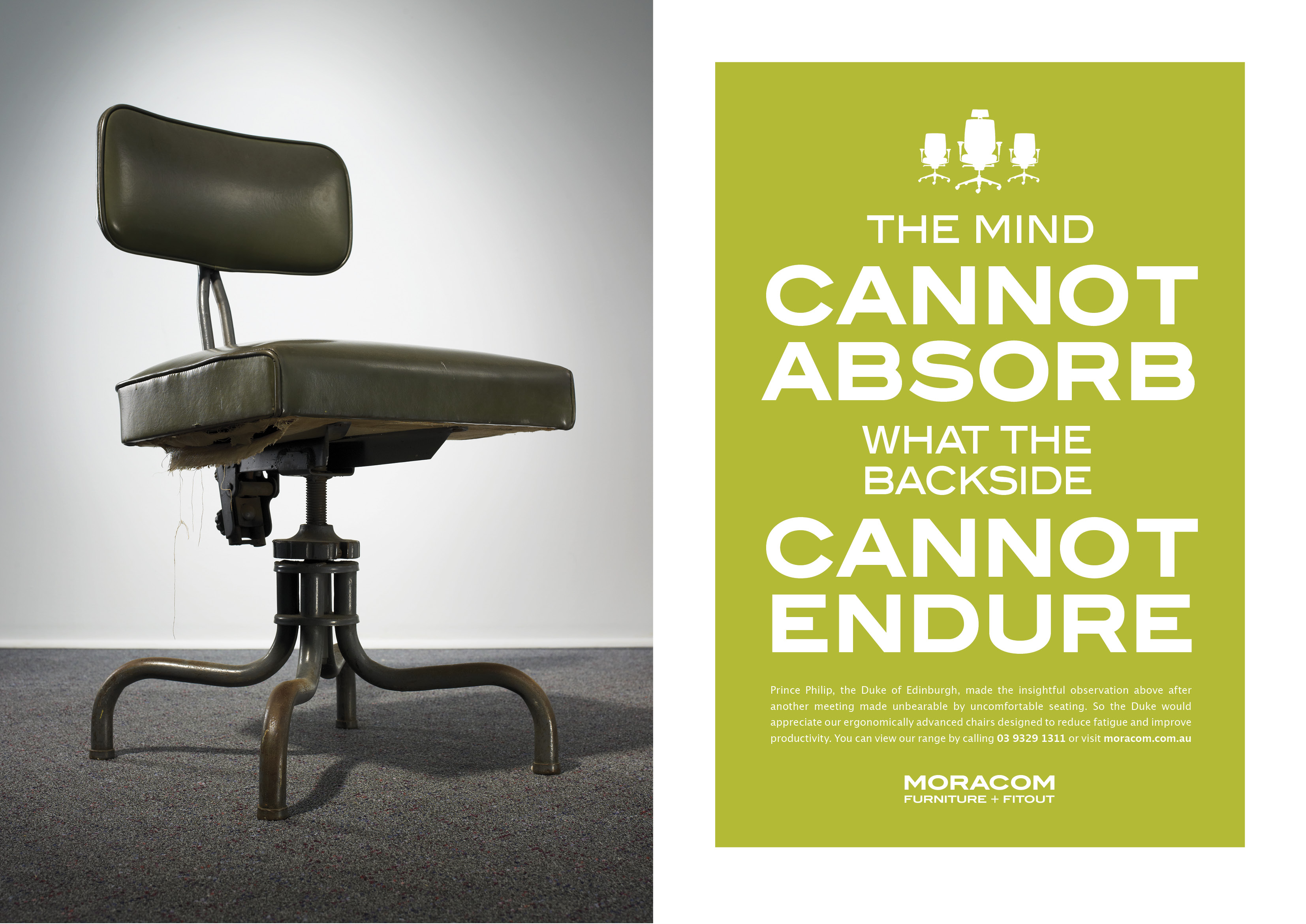 Melbourne creative agency Spinach Advertising has seized on the words on Prince Philip in a tactical print and poster campaign for client Moracom Furniture + Fitout.