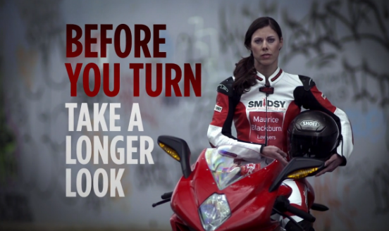 The copy in the ad reads: “In 84% of rider fatalities, where drivers turned into, or across, the path of the motorcycle — the driver was at fault. Not the motorcyclist. Before you turn. Take a longer look.”