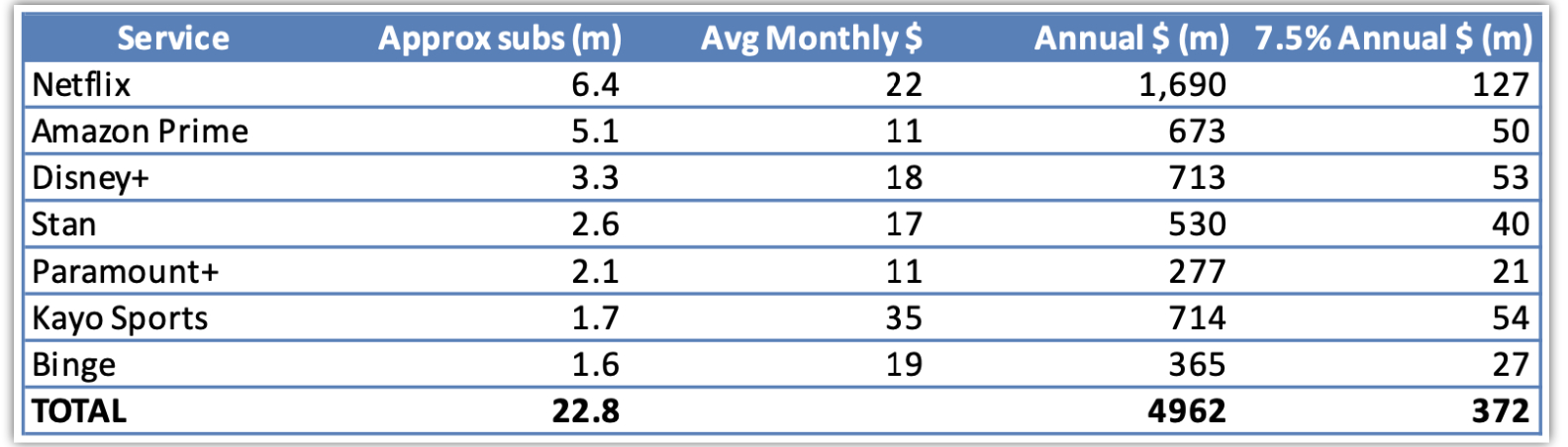 The above table is a conservative estimate that includes subscription revenue only (no advertising), calculated by using local subscription figures from various third-party sources, and multiplying this by the cost of the middle tier available to customers. It also includes Stan, which is part of Nine (which is already subject to local content quotas).