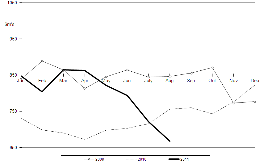 After flatlining for most of the year, a decline in the value of new business activity began in Sydney and Melbourne in April, accelerated in June and by August had reached a three-year low.