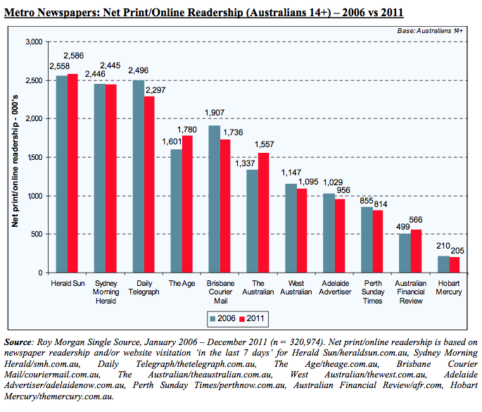 According to data collected from 2006 to December 2011, The Australian, Australian Financial Review, Herald Sun and The Age newspapers all achieved an increase in net print/online readership.