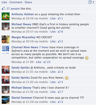 This is not the first “off message” post on the page. In recent days, the account has not only “liked” the Seven News Facebook page, but has also asked users whether or not Nine should broadcast the cricket instead of its flood coverage.
