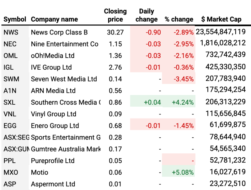 Seven West Media lost 3.5% while Ooh Media lost 2.5%.