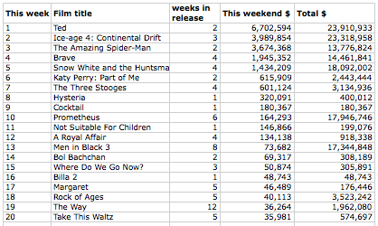In general release Ted, directed by Seth MacFarlane and distributed by Universal, continues to dominate at the box office with another $6.702m across 411 screens for a $16,308 average. It takes the film, officially in its second week, to $23.91m.