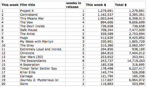 Project X, produced by Todd Phillips (The Hangover) with Joel Silver (The Matrix, Sherlock Holmes) among others executive producing, took $1.28m at the box office in its first weekend out.