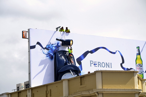 A giant Vespa motorbike has been built on top of Taylor Square’s Oxford Hotel in Sydney as part of a Peroni Nastro Azzurro billboard.