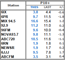 Behind Mix, 92.9 placed second overall with ABC720 taking third place. Nova placed fourth (9.8% share), 96FM placed fifth (9.6% share) and 6PR placed sixth (9.7% share) down from last survey’s third place.